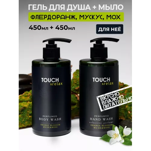 Парфюмированный набор гель для душа и жидкое мыло TOUCH&relax с нотами флердоранж, мускус и мох, станет прекрасным дополнением вашего ежедневного ритуала ухода за собой. Начнется аромат с яркого и сочного запаха цитрусовых и апельсина, который придаст вашей коже легкость и свежесть. Постепенно раскроется цветочная нота флердоранжа, добавляя аромату женственности и нежности. Мускусные ноты придадут аромату чувственность и глубину, создавая загадочный шлейф. Наконец, мох придаст композиции теплоту и уюта, завершая ароматическое путешествие на вашей коже. В итоге, вы почувствуете нежность, свежесть и чувственность этого аромата, который будет дарить вам радость и умиротворение в течение дня. Гель для душа не только очистит вашу кожу, но и наполнит ее нежным ароматом, придающим ощущение бодрости и уверенности. Благодаря гиалуроновой кислоте, аминокислотному комплексу, натуральным маслам и другим активным ингредиентам, ваша кожа будет увлажнена, питательна и сияющей. Гель также обладает нежной текстурой, легко вспенивается и не пересушивает кожу. Жидкий гель мыло для мытья рук с тем же ароматом обеспечит уход и защиту вашим рукам. Благодаря молочной кислоте, д-пантенолу, витамину Е, натуральным маслам и другим активным компонентам ваша кожа будет увлажненная, гладкая и ухоженная. Нежная текстура геля легко очистит кожу рук, при этом оставляя приятный аромат и ощущение комфорта. Оба продукта обеспечивают непревзойденный уход, подходят для всех типов кожи и упакованы в удобные флаконы объемом 450 мл. Насладитесь роскошным ароматом и качественным уходом с ТАЧ релакс. Набор станет отличным новогодним подарком к Новому году.